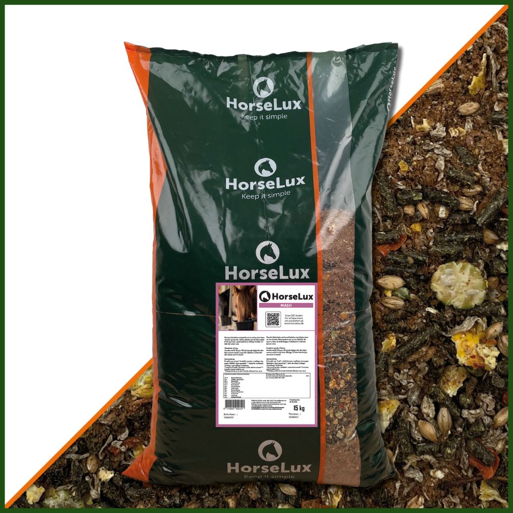 Hvis du ønsker en lavere tildeling af stivelse, kan du med fordel blande Mash op med HorseLux FiberPellets, da det samlet set vil minimere indtaget af stivelse.