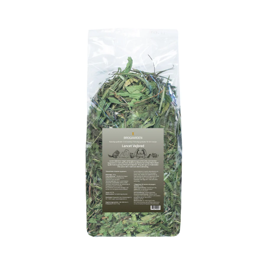 - Lancetvejbred er rig på fibre, hvilket er afgørende for en sund fordøjelse hos kaniner og gnavere. Fibrene bidrager til at opretholde en god fordøjelse, samt en velfungerende mavefunktion.