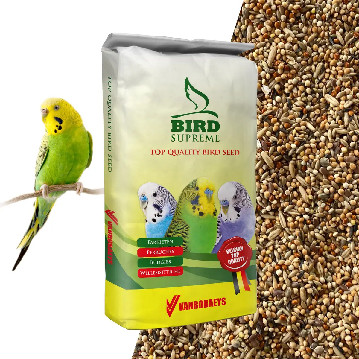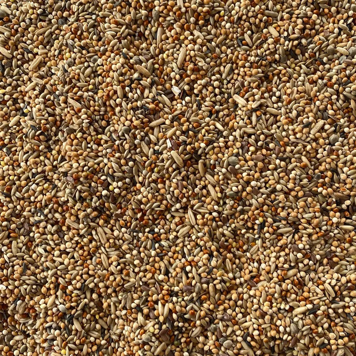 Gul hirse 35%, kanariefrø 22%, hvid hirse 12%, rød hirse 8%, afskallet havre 7%, japansk hirse 5%, pancium 4%, hørfrø 3%, hampfrø 2%, nigerfrø 2%.